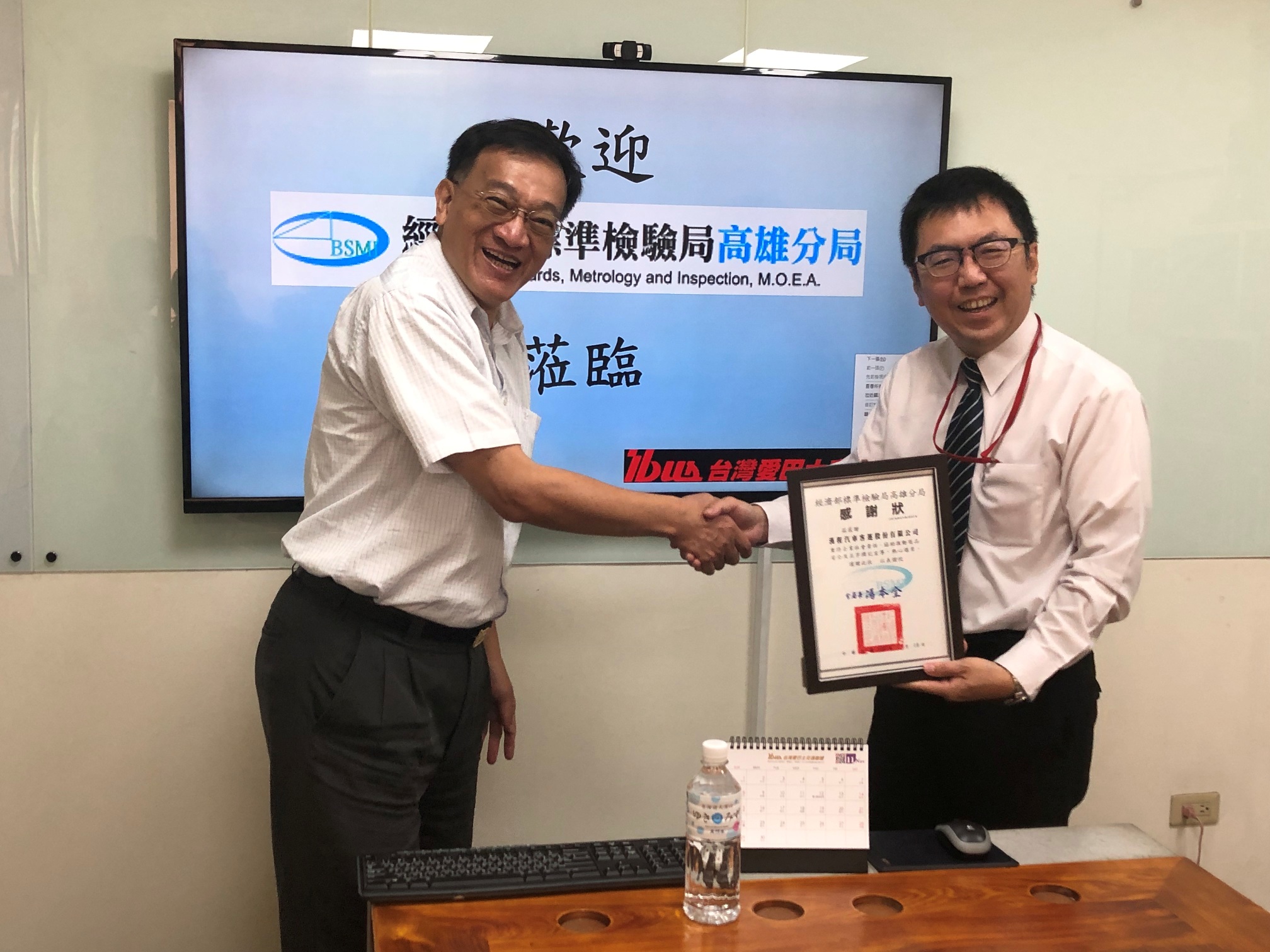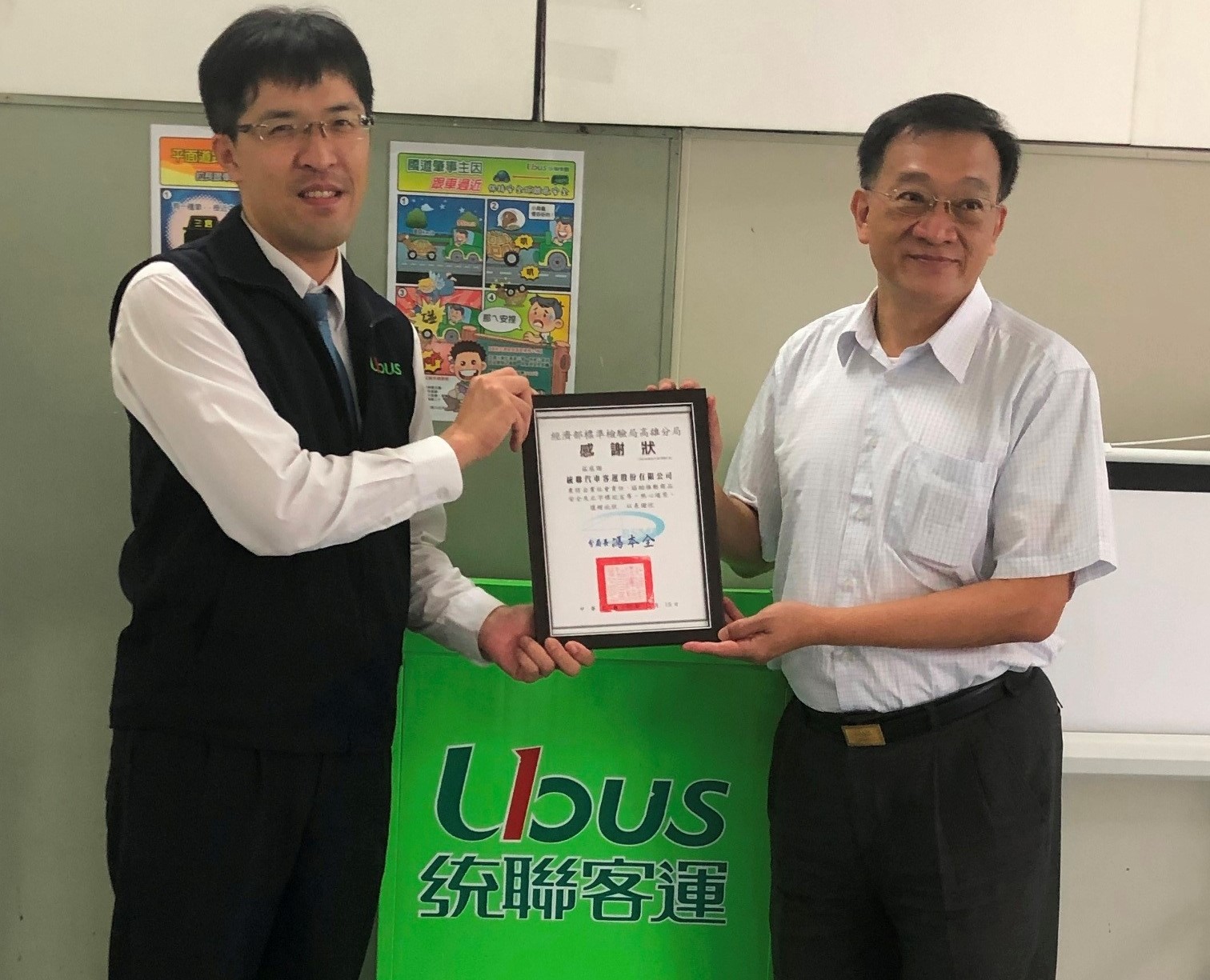 時值將屆年底,為答謝2家客運業者近1年來無償提供及大力協助文宣廣告,敲定安排109年11月19日本分局陳副分局長吉盛帶著長官感謝及表達高度敬佩的口信,由陳主任文琪及蔡課長昇諺等陪同拜訪及致贈感謝狀行程,以表彰其對本分局推廣商品安全協助與支持。在雙方拜訪對談場次中,統聯客運高雄營業部謝主任耀霆表示,公司對配合公務主管機關政策文宣,基於企業社會責任的使命感下,皆會給予最大的支持,同時允諾也可利用公車內手拉環上廣告框做政策宣導。隨後在漢程客運高雄區韓總經理洪開率領資訊室潘主任衛東等公司幹部會面,於會談中亦相談甚歡,同樣也秉持企業社會責任的精神,除了續予支持外,也交代協助本分局宣傳文件可放置予公車內妥適處。