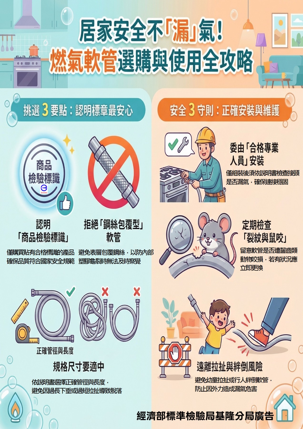 燃氣設備是家庭日常生活中不可或缺的重要設施,為確保民眾使用燃氣器具時的安全,燃氣用塑膠軟管已列為應施檢驗商品。燃氣用塑膠軟管多用於連接瓦斯爐、熱水器等燃氣器具,其品質與安裝是否正確,與居家安全息息相關。